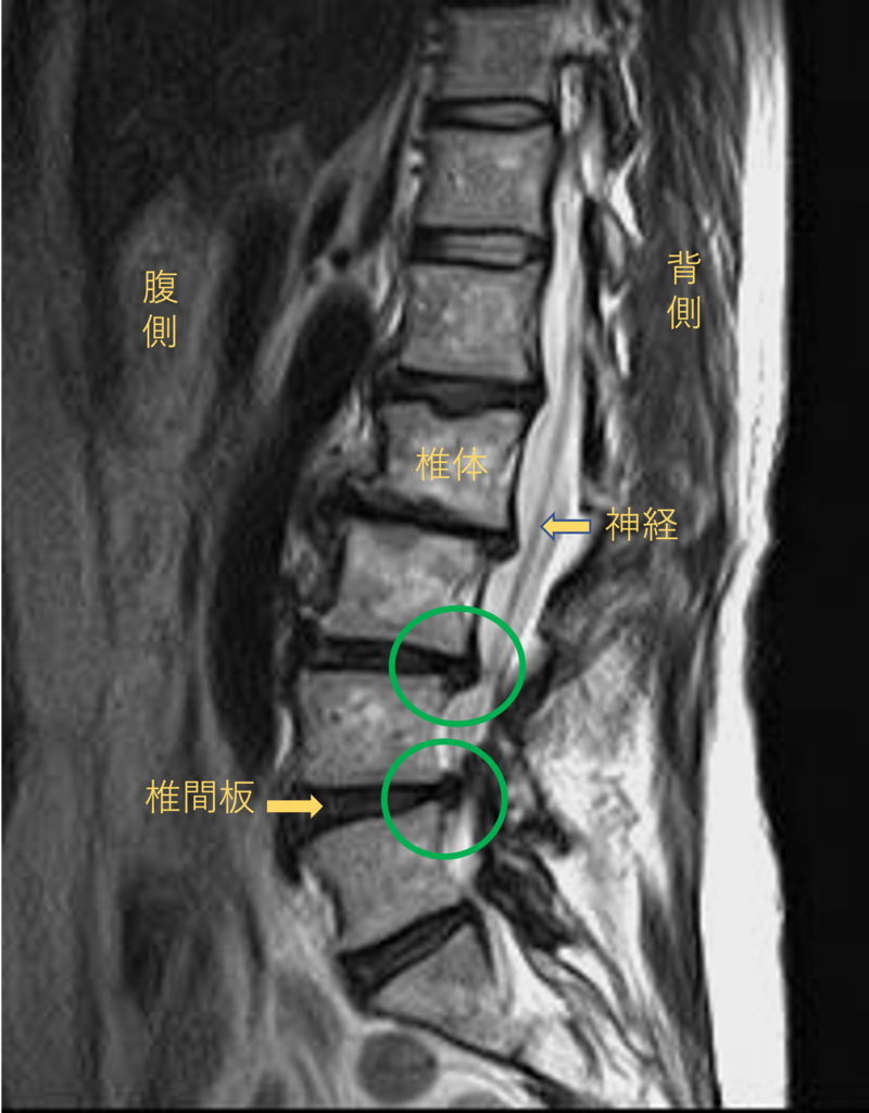 このMRI画像では、椎間板が背中側に飛び出して足に向かう神経が圧迫されることが痛み、しびれの原因となっておりました。