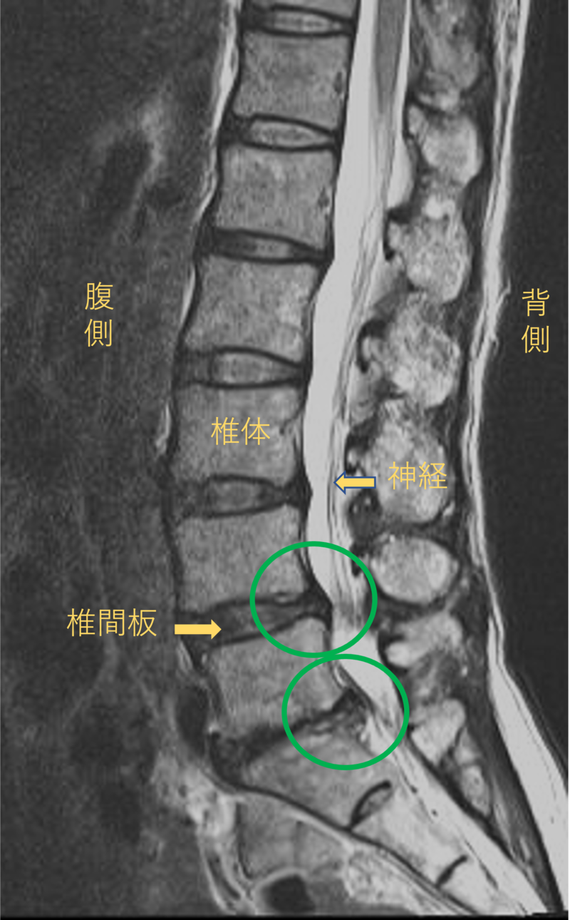 このMRI画像では、椎間板が背中側に飛び出して足に向かう神経が圧迫されることが痛み、しびれの原因となっておりました。
