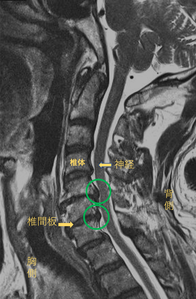 このMRI画像では、椎間板が背中側に飛び出して神経が圧迫されることが痛み、しびれの原因となっておりました。