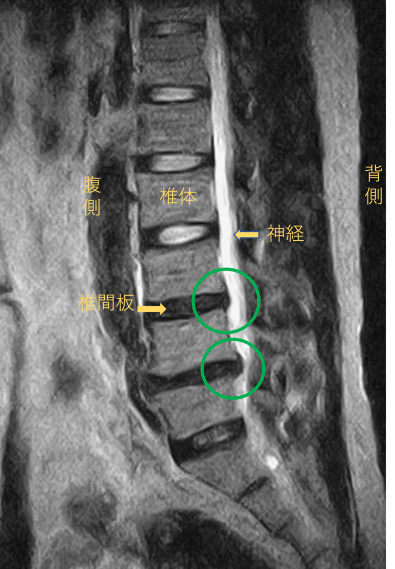 このMRI画像では、椎間板が背中側に飛び出して足に向かう神経が圧迫されることが痛み、しびれの原因となっておりました。