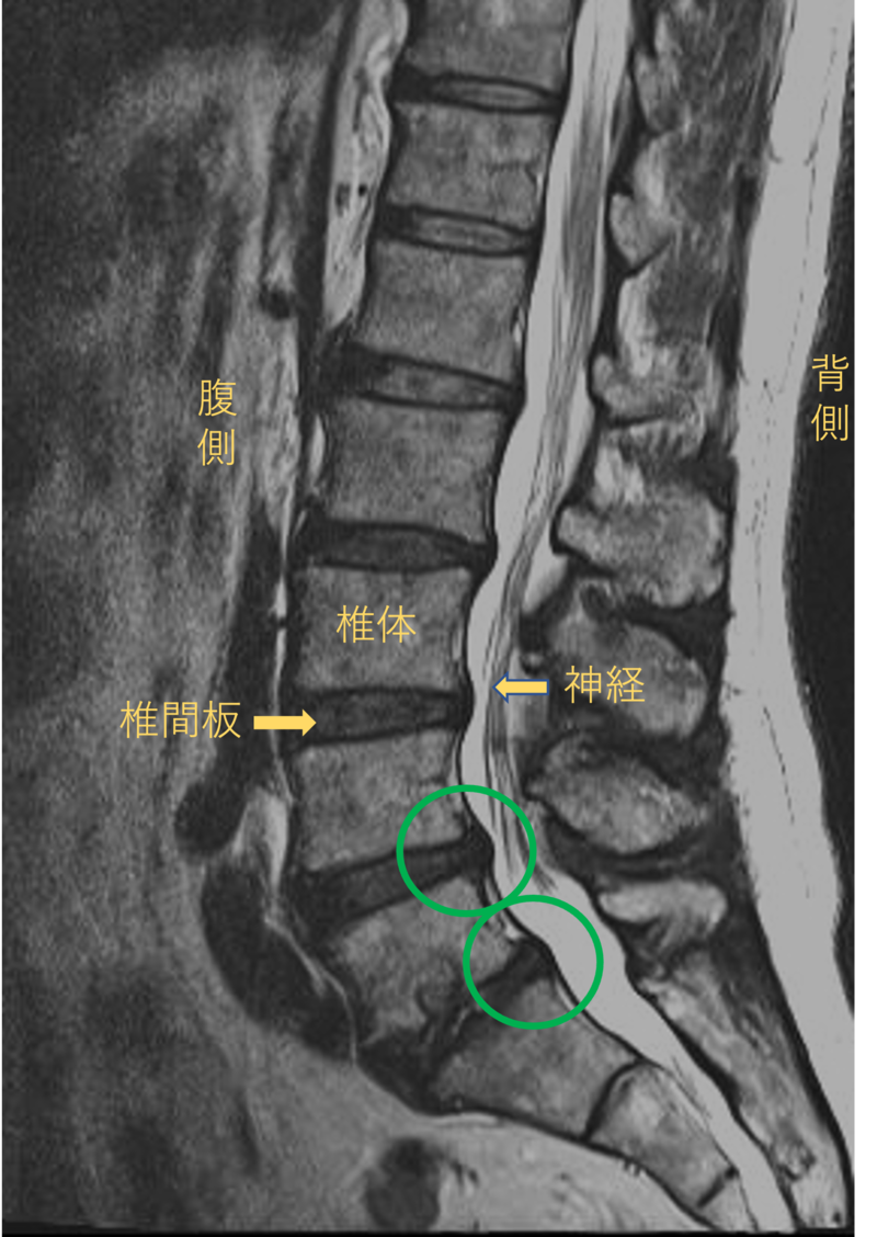 このMRI画像では、椎間板が背中側に飛び出して足に向かう神経が圧迫されることが痛み、しびれの原因となっておりました。