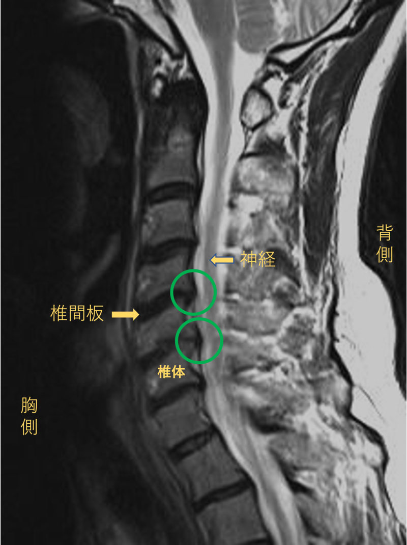 このMRI画像では、椎間板が背中側に飛び出して神経が圧迫されることが痛みの原因となっておりました。